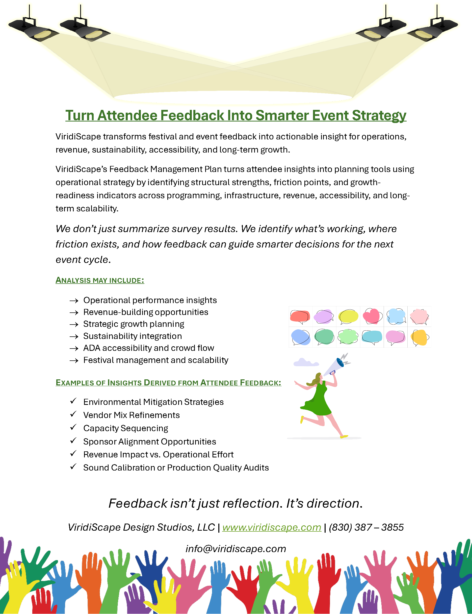 Your event is more than a gathering. It’s an experience. But, without structured feedback, you’re planning future events in the dark. Our Feedback Plan Management service gives you a complete, end-to-end system for collecting attendee insights, measuring satisfaction, and transforming those responses into clear, actionable improvements. And, it’s perfect for festivals, community events, vendor markets, city programs, workshops, and sustainability-focused experiences.